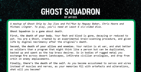 Ghost Squadron plays with your memories, and forces you to watch as your character succumbs to their military form. You are a digital clone occupying a mechanical shell, made for war, but clinging still to the shreds of the person you used to be. As you go on missions you will begin to accrue memory glitches, and if you aren’t careful you will completely lose your past. Ghost Squadron plays with the brilliant resolution mechanics of Psi*Run, where every roll is likely to fail on some front, and you are forced to choose how this failure effects you.