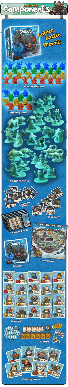 Dwar7s Winter is a hand-building, worker placement, resource management game with tower defense elements in the gameplay. It is a family friendly game for 2 to 4 players that includes highly-detailed miniatures. It plays in about 60 minutes. In Dwar7s Fall, you built your kingdom and set up means of production. In Dwar7s Winter, you need to work together to battle the harsh elements and chillingly scary monsters!”