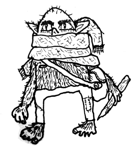 In Goblinville your goblins are still diminutive monsters with a penchant for pillaging, but instead of being generic cave dwelling enemies they have names, jobs, titles, fashion, and bosses who they have to answer to. Goblin society is a complex and multifaceted affair, and its members are as unique and varied as they come. Eric Swanson, Goblinville’s layout artist and illustrator, has done a great job of delivering a well-divided text framed by charming greyscale depictions of the titular town. A bevy of hand drawn goblins dot the pages of the zine, and are as unique as the characters you can create. Chop is a stocky, hirsute goblin who wields a pointy stick and wears a large knitted scarf. Hock is a tough looking goblin with an eyepatch and a pet rat. Gobta is a youngish goblin who wears a butcher’s smock which is always mysteriously covered in blood.