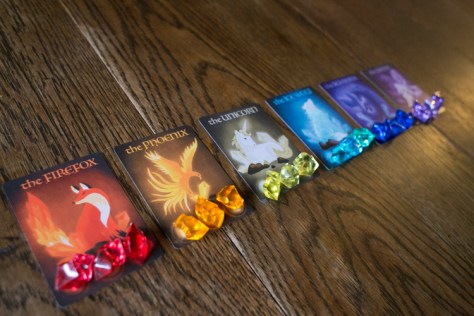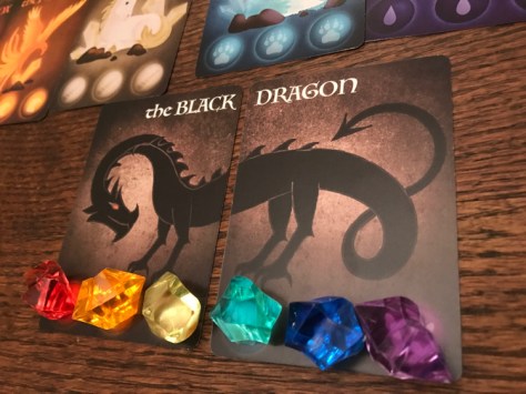 From there, you play like you normally would, with two huge exceptions. First of all, obviously, you can see all your cards at once, so you can try and plan things out before you start placing cards. Second, when you complete a square and place a gem on an orb you also place a gem of the same color on the dragon. If you run out of cards, the game ends. If you place all six colors of gem on the dragon, though, the game ends and you’ve successfully trapped the dragon in its own den using its own crystal magic!