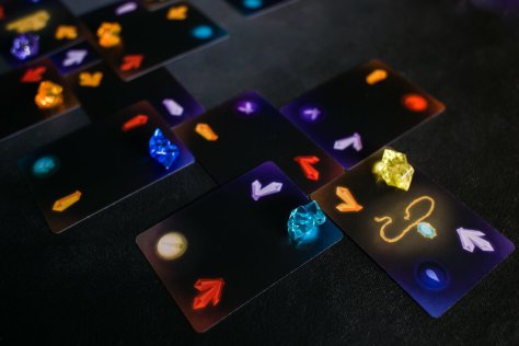 Play starts by drawing a card from the deck and placing it face-up. On each card are crystals and orbs, usually two of each but not always. Crystals come in three colors – orange, red, and purple – and three shapes, with 1-3 points to them. Orbs come in six colors, one color for each of the creatures you’re trying to free. Play proceeds by continuing to draw cards and placing them on the table; you always have to place them so that a crystal on the new card is adjacent to a crystal on an existing card, but other than that you have a lot of flexibility: cards can be placed horizontally and vertically in a number of ways, partially covering existing cards, and even partially slid underneath an existing card.