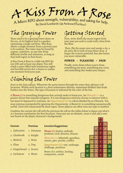 A Kiss From A Rose is a game of strength, vulnerability, and asking for help that sees the player character climbing the tower and trying to gain the ability to erase the cause of their regrets. There’s an interesting little tower crawl map that will dictate what exactly the characters will run into; whatever it is, they are trying to get a 4 or better on the dice. Said dice are a d4, d6, and d8 assigned to Power (physical prowess), Pleasure (mental prowess), and Pain (violence). A 3 or lower on the die means that the character will instead face a Consequence, from losing equipment to death. They always get the chance to push back and roll to avoid the Consequence.