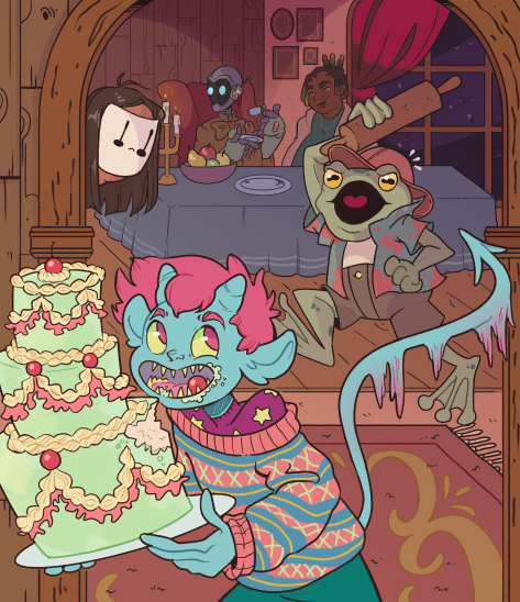 “There were a lot of guests we came up with starting out, including a sentient furnace, a genderfluid cowgirl named Boy Howdy, and a troll assassin trying to kill Yazeba, that we didn’t keep for one reason or another. At one point there was a guest who was supposed to be a wizard from Yazeba’s life pre-transition, who we thought might explore some of the uncomfortableness of reconnecting with old friends who know a version of you that’s gone, but we couldn’t write about him without getting mad, so we ended up cutting him.