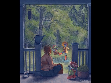 “A teen girl sits on the windowsill, reading a well-worn paperback and listening to the splashy-crashy rain come down. She’s alone in the world, but soon enough the strangers who reside here will become her closest friends, family, and mentors.