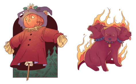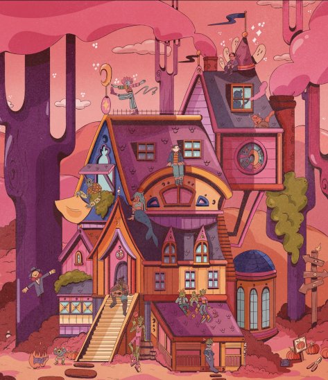 This book is the door into a world of heartless witches and devil children, of cursed frog knights and rabbits who wear little outfits, of aspiring rockstars and spaceships carjacked from the Moon Queen’s palace. We might cook up a breakfast banquet, go trick-or-treating under a sallow moon, put on a disastrous play, or catch fireflies under the stars. So stay the night, unpack your bags, and get ready to explore the world’s most magical Bed & Breakfast!”