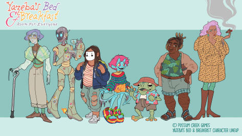 Outside of Yazeba’s, we’ve both amassed a lot of ideas and creative urges while working on this massive project that didn’t quite fit the Bed & Breakfast that we’ll want to explore when the dust settles. Jay’s Itch.io is possumcreekgames.itch.io and M’s is nightling-bug.itch.io, and between there and the Possum Creek Patreon you can find all sorts of stuff, including works in progress.”