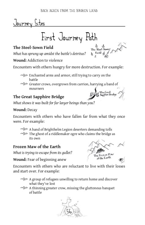 The GM can choose one of two paths to send the fellowship along, each with six locations. For those keeping track at home, that means a full journey in Back Again could be resolved in as few as five hits using Chart a Course, making the 1 of the expected 1-3 sessions quite doable. Each location has some building blocks: a question that can be used to flesh it out, a type of wound that the conflict with the Doomlord inflicted on the land or the people here, and some example encounters for the characters to experience.