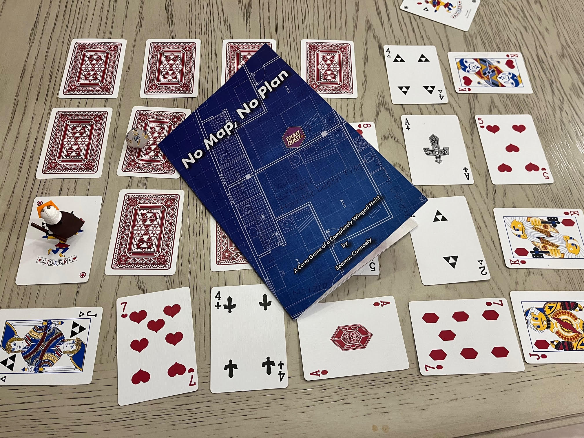 The wrinkles I spliced in, especially after reading several more Carta games, was that the player would have a Stealth Rating (starting at 4) that would be added to the roll of a d12 whenever prompted to roll a Stealth Check (mostly Spades). Failed Stealth Checks reduce Stealth Rating by 1. Acquiring Pieces of Treasure is the goal, but each one reduces your Stealth Rating as well. When Stealth is reduced to 0 for the first time, The Alarm Is Raised!