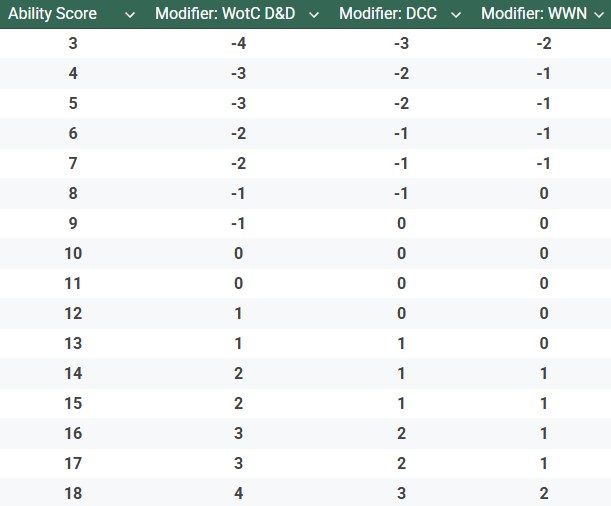 The statistical impact of attributes is altered dramatically between these games; WWN has half the modifier range of D&D 5e. This is of course further modified in 5e by using 4d6 drop lowest; in D&D 5e you have four times the probability of rolling an attribute with a positive modifier as you do in WWN, with almost the same probability of rolling a negative modifier (16% versus 17%). D&D characters will simply be more effective than WWN characters, while the two games saddle you with about the same chance to actually be penalized. Although Worlds Without Number (and its other Without Number cousins which generally use the same modifier distribution) intends for character capability to be more muted, the flatter distribution also tends to make characters feel a little samey. There is a nearly 10% chance that after you’ve rolled your stats in Worlds Without Number you have modifiers of zero across the board. In D&D 5e there’s less than a one-in-ten thousand chance of that happening.