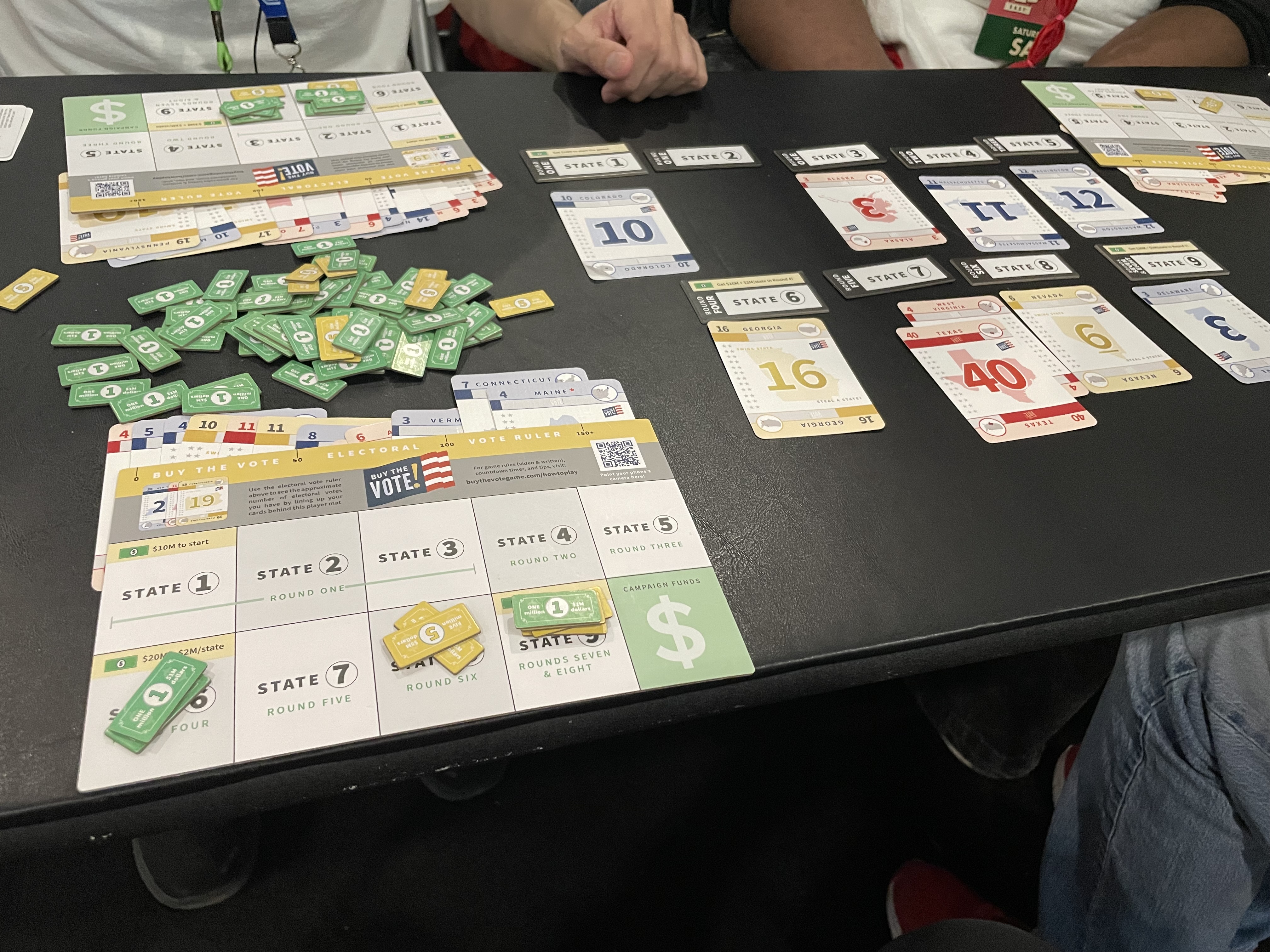 At the start of the first round three states are placed on the table, each one being worth a certain number of votes. Players then, within their little voting booth, place bids to gain them and then reveal their bids at the same time. A player bid the most? They get that state. If a state had no bids placed upon it then it stays on the table, and as more states get dealt it start to build an ever-more-valuable stack. There was a tie? The money still gets spent, and the state also stays on the table.